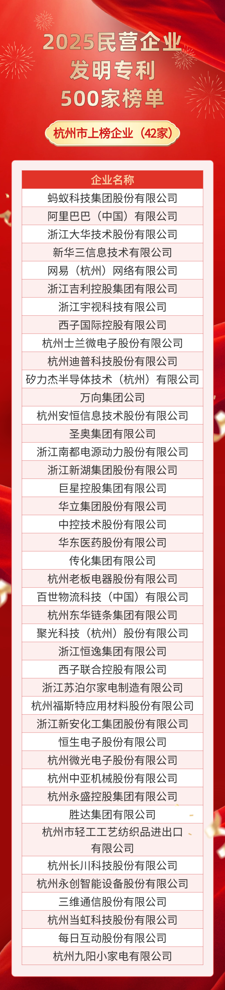 在“2025民营企业发明专利500家”榜单中,入围门槛为187件,杭州市有42家企业上榜,上榜企业数占全国的8.40%,占浙江省(115家)的36.52%。