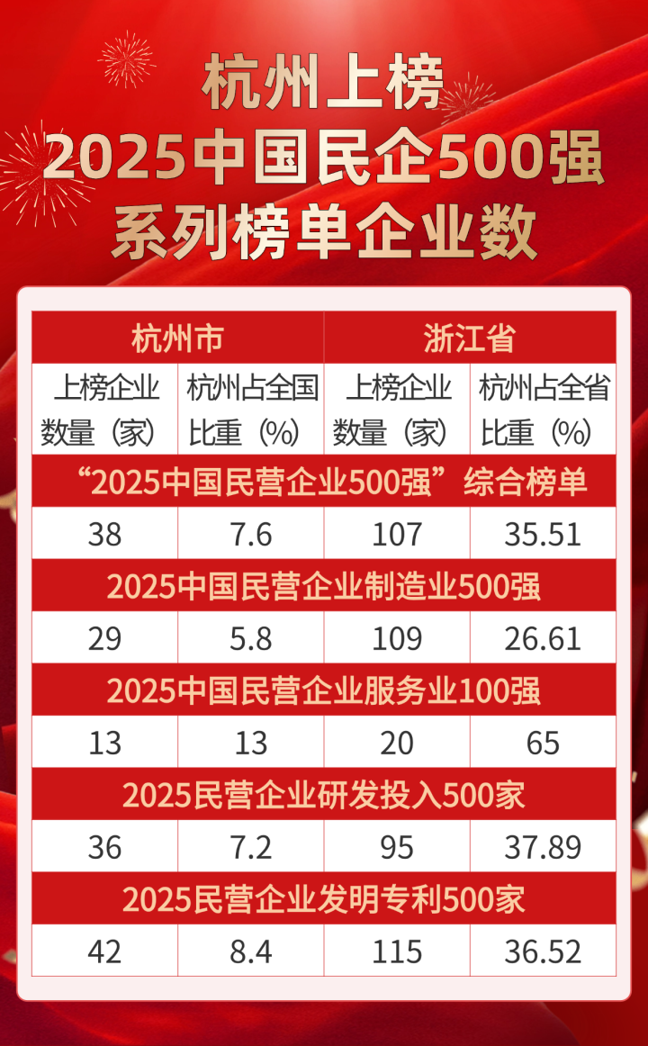 杭州在这五张榜单上的表现均十分亮眼:在“2025中国民营企业500强”综合榜单和2025中国民企制造业500强、服务业100强、研发投入500强、发明专利500强五张榜单中,杭州上榜企业数均居全国城市首位、全省各地市第一,实现五张榜单“大满贯”。