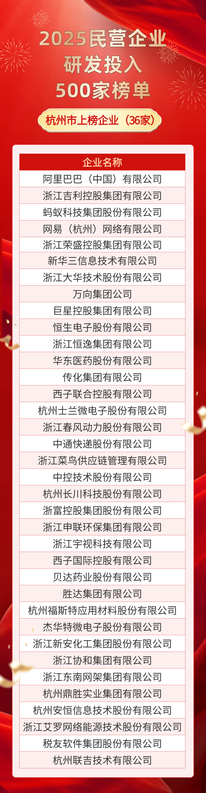 “2025民营企业研发投入500家”的入围门槛为4.65亿元,杭州市有36家企业上榜,上榜企业数占全国的7.20%,占浙江省(95家)的37.89%。