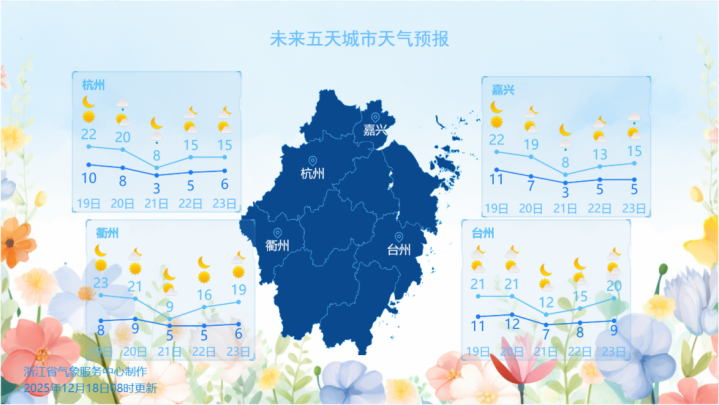 今天早晨气温起步较低,最低气温浙北北部1-4℃,东南沿海7-9℃,其它地区大部4-7℃。白天晴到多云,气温回升较快,预计最高气温大部可达18-20℃。明天(12月19日)受暖湿气流影响,气温还将继续回升,最高气温部分地区妥妥20℃+,如丽水,最高或将冲上23℃。后天周六白天依旧是“小阳春”的体感。